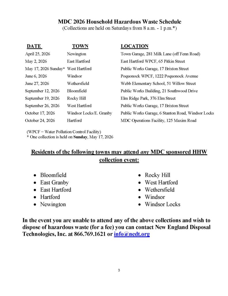 (HARTFORD, CT) – Each year, the Metropolitan District (MDC) provides its customers with an environmentally-friendly initiative, the Household Hazardous Waste Collection (HazWaste) program. The 2026 HazWaste Program is scheduled to begin on Saturday, April 25 in Newington.
